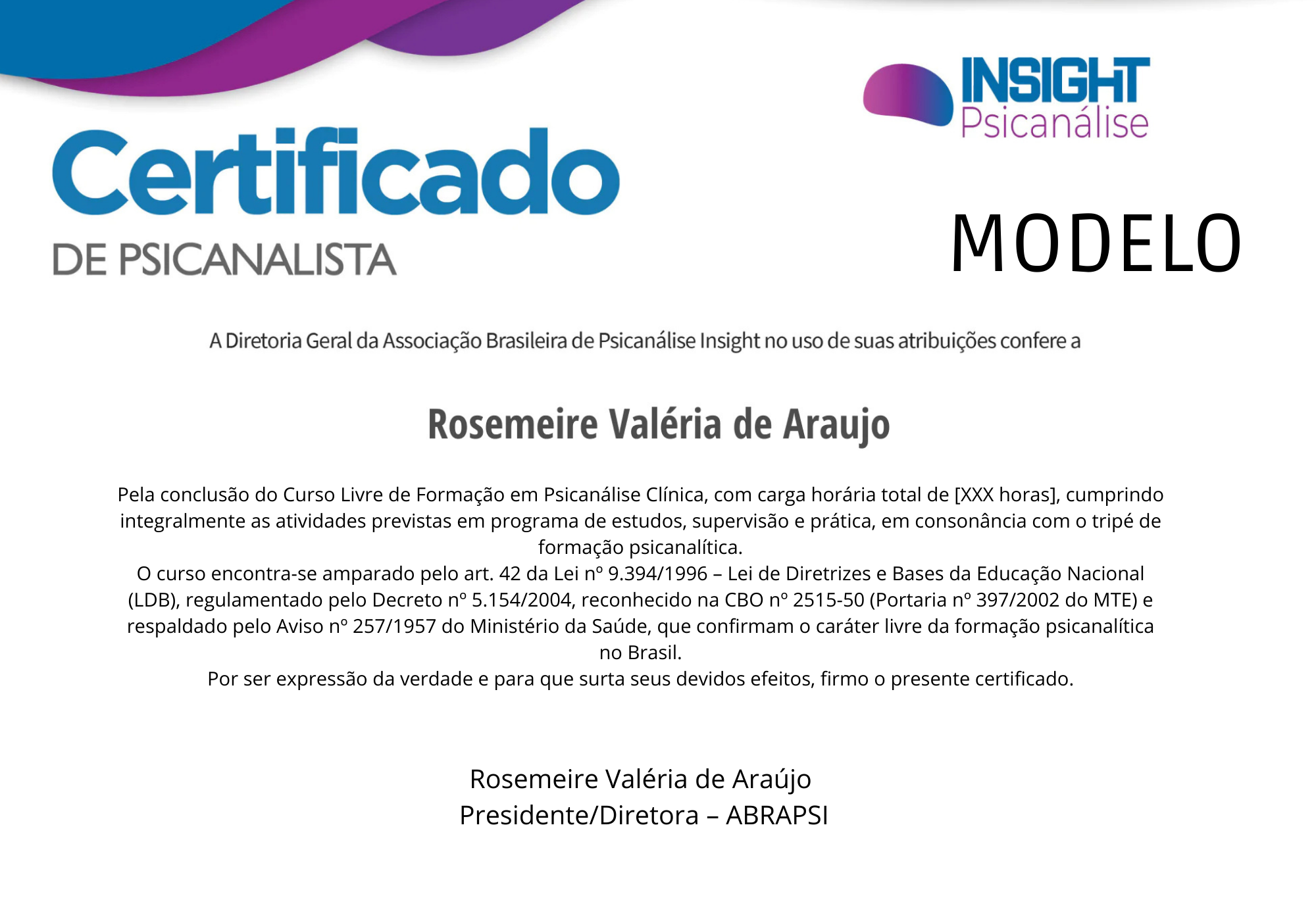 Respaldo Legal da Formação em Psicanalise pela Insight Psicanálise: A Formação em Psicanálise é de caráter Livre no Brasil, porém, é reconhecida e amparada pela Portaria 397 de 09/10/2002 do Ministério do Trabalho e Emprego – CBO nº 2515-50 e Aviso 257/57 do Ministério da Saúde; Decreto Federal 2208 de 17/04/97, Portaria 397 do Ministério do Trabalho, Parecer CONJUR/MS/CMA 452/2.